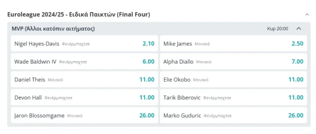Αυτό που παρουσιάζει πλέον ιδιαίτερο ενδιαφέρον όσον αφορά τα προγνωστικά Final-4 2025 είναι η μάχη για τον τίτλο του MVP. Μετά τις ήττες του Παναθηναϊκού και του Ολυμπιακού, δεν έχουμε στην σχετική λίστα ούτε τον Κέντρικ Ναν, ούτε τον Σάσα Βεζένκοφ, τους δύο παίκτες που διεκδίκησαν τον τίτλο στην κανονική διάρκεια της σεζόν. Πλέον η μάχη είναι ανάμεσα στον Χέιζ Ντέιβις και τον Μάικ Τζέιμς.