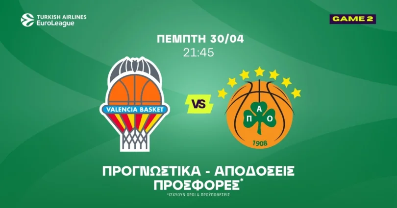 Προγνωστικά Βαλένθια – Παναθηναϊκός (30/04/2026): Το Game 2 της σειράς είναι γεγονός και το BetMarket.gr έχει την ανάλυση και τα προγνωστικά Euroleague σήμερα.