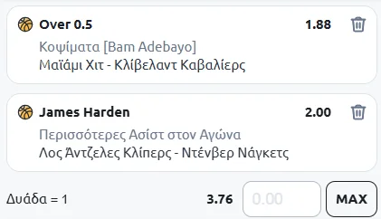 | 28/04, 01:00 | NBA | Λος Άντζελες Κλίπερς – Ντένβερ Νάγκετς | Χάρντεν περισσότερες ασίστ @ 2.00 | |