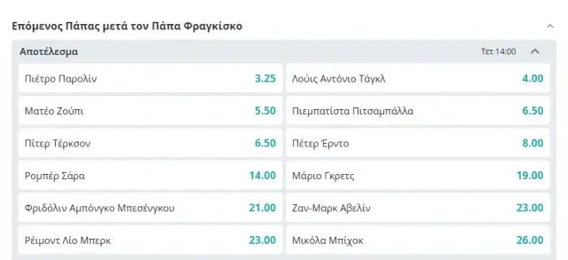 Μόλις ολοκληρώσετε την συγκεκριμένη διαδικασία, έχετε πρόσβαση στο να διασκεδάση μέσω στοιχήματος. Εντοπίζετε την κατηγορία “διασκέδαση” και στις επιλογές θα βρείτε το “Επόμενος Πάπας”. Εκεί, ανοίγει και μία λίστα με όλους τους υποψήφιους και δίπλα αναγράφονται οι αποδόσεις.
