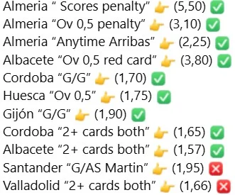 Αυτό που θα ποντάρουμε, όμως, είναι το 2+ κάρτες και οι δύο ομάδες, καθώς περιμένουμε ένα σκληρό ματς, ενώ είναι και σκληροτράχηλες (2.8 μέσο όρο η γηπεδούχος και 2.5 η φιλοξενούμενη). Επίσης, το επιβεβαίωσαν πανηγυρικά στην αναμέτρηση του πρώτου γύρου (1-0 η νεοφώτιστη) όπου ο ρέφερι Λαξ έδειξε 9 συνολικά (5 στην Μπούργος και 4 στη Θέουτα)! Απόψε σφυρίζει ο Ράφαελ Λόπεθ, ο οποίος έχει 84 σε 17 αγωνιστικές. Ακόμα: