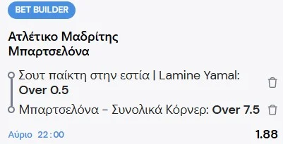 Το «2» της Μπάρτσα δίνει 1.80 μέσο όρο στις στοιχηματικές εταιρίες, ενώ τα Over 2.5 και Goal/Goal είναι στο 1.35. Εξυπακούεται ότι pregame δεν υπάρχει αξία σε αυτές τι τιμές. Επομένως, θα πάμε σε ένα Bet Builder δύο επιλογών. Η πρώτη είναι το 1+ σουτ του Γιαμάλ στον στόχο. Ο 18χρονος εξτρέμ έχει πάρει προσωπικά το θέμα της πρόκρισης (εκπροσώπησε και τους συμπαίκτες του στη χθεσινή συνέντευξη Τύπου) και θα ψάξει το γκολ με κάθε τρόπο. Εξάλλου, είναι σημαντικό που σκόραρε με την Εσπανιόλ, καθώς του έφυγε το άγχος (ήταν «άσφαιρος» για 5 ματς με Μπάρτσα και Εθνική). Δεύτερη είναι το Over 7.5 κόρνερ των Καταλανών. Διαλυμένες είναι και στα κόρνερ οι τιμές, αλλά δεν το θεωρούμε παράλογο, αφού η πίεση που θα ασκήσουν αναμένεται να είναι ασφυκτική από το πρώτο λεπτό. Επίσης, το έβγαλαν στα 3/4 κόντρα στην Ατλέτικο και σε αυτό που δεν πέρασε σταμάτησαν στα 7.