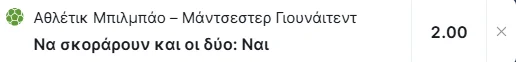 | 01/05, 22:00 | Μπιλμπάο – Μάντσεστερ Γιουνάιτεντ | Goal/Goal @ 2.00 | ![]() |