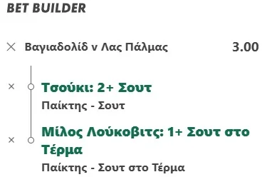 Ως εκ τούτου, πάμε στους παίκτες και σε ένα Bet Builder με τους Τσούκι (10/3), Λούκοβιτς (10/3). Ο 21χρονος μεσοεπιθετικός της Βαγιαδολίδ αναμένεται, σύμφωνα με τα ρεπορτάζ, να ξεκινήσει δίπλα στον Μάρκος Αντρέ λόγω της απουσίας του τραυματία Λατάσα και του Άρνου (στην U19). Ο μικρός έκανε μέχρι χθες προπονήσεις με την Εθνική και υπήρχε περίπτωση να μπει στην αποστολή εάν προλάβαινε να γυρίσει. Ήταν άγνωστο αυτό όταν γράφαμε το κείμενο, αλλά ούτως ή άλλως έχει 4 συμμετοχές, όλες ως αλλαγή. Επίσης, αν αποφασίσει ο Αλμάδα να παίξει με έναν μπροστά, ο Τσούκι θα βρεθεί πίσω από τον Αντρέ. Ποντάρουμε τα 2+ σουτ του που επιβεβαίωσε στα 4/6 μπαίνοντας αλλαγή στα 5/6! Μάλιστα, στο προηγούμενο με την Κάντιθ (0-0) έκανε 3 σουτ αγωνιζόμενος για 33’! Επομένως, εάν ξεκινήσει το 1.83 αξίζει. Χρήζει αναφοράς ότι στην έτερη στοιχηματική εταιρία που έχει αυτή την αγορά, τη Winmasters, έδινε 1.34!