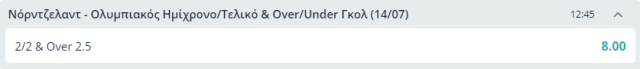 Από την άλλη, η Novibet προσφέρει και αυτή με τη σειρά της μία επιλογές στις ενισχυμένες* αποδόσεις του Νόρτζελαντ – Ολυμπιακός. Συγκεκριμένα, το 2 ημίχρονο/2 τελικό και το over 2,5 έχει απόδοση 8.00. Συνεπώς, για κάποιον που «βλέπει» νίκη των Πειραιωτών και με αρκετά γκολ, είναι ένα καλό σημείο.