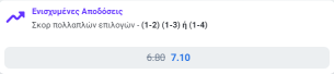 Ενδιαφέρον έχουν και οι ενισχυμένες* αποδόσεις στο δεύτερο φιλικό που δίνει ο Ολυμπιακός κόντρα στη Νόρτζελαντ. Συγκεκριμένα, η Stoiximan.gr προσφέρει επιλογή για σκορ πολλαπλών επιλογών 1-2, 1-3 ή 1-4 σε απόδοση 7,10 από το αρχικό 6,00.