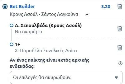 Παρεμπιπτόντως, να αναφέρουμε εδώ ότι μπήκε στο παιχνίδι με την αγορά «γκολ ή ασίστ» και η Stoiximan. Για τον Παραδέλα ήταν στο 2.27 η ασίστ και στο 1.60 το γκολ ή ασίστ. Επίσης, το Bet Builder με το anytime του Σεπούλβεδα άγγιζε το… δυσθεώρατο 3.20! Τέτοιες τιμές απωθούν τον σωστό παίκτη, ενώ εδώ δεν υπάρχει και το «SUB+», ώστε να γίνουν κάπως πιο ελκυστικές.