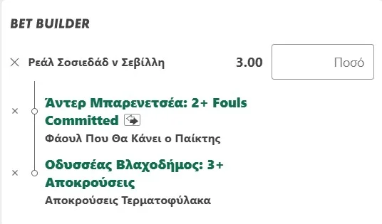 Θα πάμε σε ένα Bet Builder με δύο ειδικά παικτών. Ο πρώτος είναι ο Μπαρενετσέα της Σοσιεδάδ και θα ποντάρουμε το Over 1.5 φάουλ του. Ο 23χρονος εξτρέμ είναι επιρρεπής στην εν λόγω παράβαση, διότι δυσκολεύεται πολλές φορές να ελέγξει την μπάλα όταν την έχει στα πόδια του. Εξάλλου, επιβεβαίωσε το Over 1.5 στους 3/4 αγώνες. Στους 2 πιο πρόσφατους, μάλιστα, υπέπεσε σε 3 (στο 3.25 στην Bet365). Επίσης, στις 7/9 αγωνιστικές είχε τουλάχιστον 1. Σήμερα που η πίεση είναι ακόμα μεγαλύτερη ένεκα της ανάγκης για νίκη, μπορεί να βάλει με περισσότερο πάθος τα… πόδια στη φωτιά.
