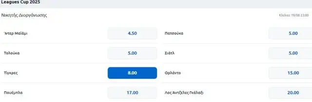 Προτού πάμε στα σημερινά, επειδή έχουμε εκφράσει τον ενθουσιασμό μας γι’ αυτά που βλέπουμε από την Τίγκρες και παρακολουθήσαμε και το Leagues Cup, οφείλουμε να αναφέρουμε ότι είναι τιμιότατο το 8.00 που δίνουν, όσες στοιχηματικές εταιρίες έβγαλαν μέχρι τώρα αποδόσεις (Bet365, Novibet, Stoiximan), για την κατάκτηση της συγκεκριμένης διοργάνωσης. Είναι τόσο ψηλά, γιατί παίζει με την Ίντερ Μαϊάμι του Μέσι στους «8» (21/8 το ματς). Βάσει εικόνας, όμως, και των δύο από Apertura, MLS και Leagues Cup, θεωρούμε καλύτερη ομάδα την Τίγκρες.