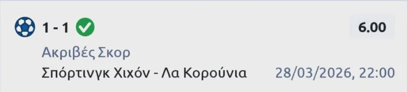 Να ξεκινήσει από 1-1 ήταν ο μεσότιτλος στο Χιχόν – Λα Κορούνια χθες και μέσα στο κείμενο γράψαμε: Εξάλλου, δε θα μας κάνει εντύπωση εάν λήξει ισόπαλο το ματς. Αν συμβεί αυτό, όμως, περιμένουμε να είναι με Goal/Goal. Τελικό 1-1 και έτσι πληρωθήκαμε τη δυάδα με τα γκολ, αφού νωρίτερα η Ουέσκα σκόραρε μέσα στη Γρανάδα (2-4). Χρειάστηκε, βέβαια, να φάει 3 στο πρώτο ημίωρο για να πάρει μπρος, αλλά τέλος καλά όλα καλά. Επίσης, «τσίμπησαν» και το 1-1 ακριβές σκορ τα… τσακάλια της στήλης!