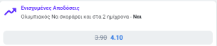 Η Stoiximan.gr προσφέρει σε ενισχυμένη* απόδοση την επιλογή να σκοράρει ο Ολυμπιακός και στα δύο ημίχρονα σε απόδοση 4.10, από το αρχικό 3.90.