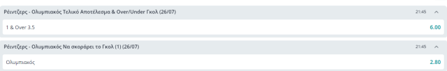 Η Novibet προσφέρει δύο επιλογές σε ενισχυμένη* απόδοση. Το combo 1 & Over 1.5, σε απόδοση 6.00 και την επιλογή να σκοράρει ο Ολυμπιακός το 1ο γκολ της αναμέτρησης σε απόδοση 2.80.