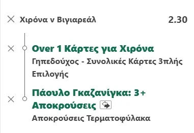 Η άλλη είναι το Over 1.5 κάρτες της Χιρόνα. Ο μέσος όρος της είναι 2.1, αλλά γενικά δεν παίζει σκληρά, ενώ δεν είναι και καρτάκιας ο ρέφερι της αναμέτρησης, Κορδέρο Βέγκα (63 σε 15 αγώνες φέτος). Οπότε, λογικά θα αναρωτηθεί κάποιος γιατί να ποντάρουμε το Over 1.5. Η εξήγηση είναι απλή. Την επόμενη αγωνιστική πηγαίνει στη Ρεάλ Μαδρίτης. Ακολούθως έχει πρόγραμμα – φωτιά με τρία ματς που θα κρίνουν το μέλλον της στη La Liga (Μπέτις εκτός, Βαλένθια εντός, Μαγιόρκα εκτός). Στο όριο είναι 4 παίκτες. Ο κίπερ Γκαζανίγκα (26/-36), ο αριστερός μπακ Μορένο (23/0), ο αριστερός εξτρέμ Γκιλ (23/0) και ο φορ Βάνατ (26/9). Δύο να πάρουν εξ’ αυτών και γίναμε! Επίσης, είδε 2+ στα 10/11 ανεξαρτήτως έδρας με τη Βιγιαρεάλ.