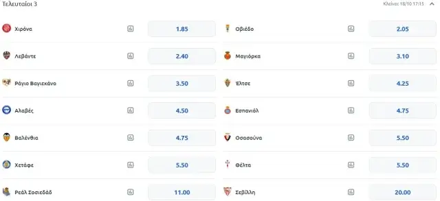 Από την άλλη, πιστεύουν ότι εξίσου δύσκολα θα μπορέσει να διεκδικήσει ένα ευρωπαϊκό εισιτήριο. Ήτοι, να τερματίσει στην πρώτη εξάδα, κάτι που είχαμε προτείνει εμείς στο αφιέρωμα της Primera Division. Ας δούμε πόσο πληρώνει αυτή τη στιγμή το εν λόγω ενδεχόμενο στους μπουκ που προσφέρουν τη συγκεκριμένη αγορά: