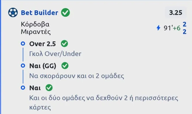 Αυτή την κατάσταση ζήσαμε με το χθεσινό Bet Builder στο Κόρδοβα – Μιρανδές (2-2). Η πρώτη επιλογή ήταν αδιαπραγμάτευτη (Goal/Goal). Η δεύτερη αφορούσε τις κάρτες στην αναμέτρηση. Η αρχική σκέψη ήταν το ασιατικό +0.5 της γηπεδούχου στο 2.07, επειδή στην έδρα της παίρνει αρκετές και ήταν «θολωμένη» από τις 6/6 ήττες. Η δεύτερη ήταν το 2+ και για τις δύο ομάδες, διότι περιμέναμε πολλά νεύρα λόγω της κρισιμότητας του αγώνα. Καταλήξαμε στο 2+, όπως ξέρετε όσοι διαβάσατε και ποντάρατε. Από εκεί και πέρα, η Κόρδοβα προηγήθηκε 2-0 στο 47’ έχοντας και 1 κάρτα. Η Μιρανδές ισοφάρισε σε έξι λεπτά (56’ – 62’) και η γηπεδούχος αντίκρισε δεύτερη στο 68’!