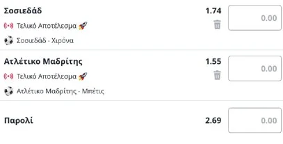 Εν τω μεταξύ, υπήρξε σημαντική υποχώρηση και στους δύο «άσους» που πρότεινε χθες η στήλη. Όπως βλέπετε και στη φωτογραφία η νίκη της Ατλέτικο (4-1) πήγε στο 1.55 (από το 1.95) μόλις ανακοίνωσε την ενδεκάδα της η Μπέτις (το παράτησε όπως το περιμέναμε). Επίσης, το ίδιο συνέβη και για τη Σοσιεδάδ (στο 1.74 από το 2.17), καθώς και η Χιρόνα ξεκίνησε με αρκετές αλλαγές στο αρχικό σχήμα. Βρέθηκε δύο φορές πίσω στο σκορ, ισοφάρισε ισάριθμες θέλοντας να μας κάνει τη ζημιά (τη δεύτερη σκόραρε ο Πόρτου, ο οποίος φόρεσε για τρεις σεζόν τη φανέλα των Βάσκων), αλλά καλύτερα που έγινε έτσι για να γραφτεί αυτή η χρυσή σελίδα στην ιστορία της Σοσιεδάδ με το τέρμα του Μαριεθκουρένα. Εξάλλου, η συνολική απόδοσης της δυάδας έδινε 2.69 (όπως βλέπετε και στη φωτό) από 4.23 που την ποντάραμε.