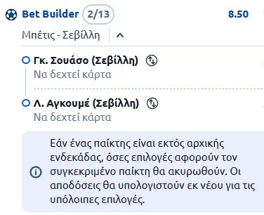 Λόγω Μπενγκοετσέα το σωστό είναι να κάνουμε τα πονταρίσματά μας στο live, ώστε να πάρουμε καλύτερες αποδόσεις, διότι όπως εξηγήσαμε και πιο πάνω αφήνει φέτος το σκληρό παιχνίδι. Επειδή, όμως η στήλη γράφεται pregame θα παίξουμε 2 ποδοσφαιριστές της Σεβίλλης να δουν κάρτα. Αυτοί είναι o αμυντικός μέσος Αγκουμέ και ο αριστερός μπακ Σουάσο (αγωνίζεται πιο μπροστά όταν παρατάσσεται η ομάδα του με 3-5-2, λογικά έτσι θα κατέβει σήμερα). Παρεμπιπτόντως, αμφότεροι είναι και στο όριο, αλλά δε θα την επιδιώξουν, καθώς την επόμενη εβδομάδα έχουν κρίσιμο εντός έδρας ματς με τη Βαγεκάνο.