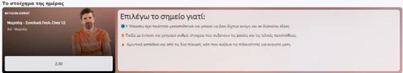Ψάχνεις ακόμα το καλύτερο σημείο της ημέρας; Τώρα η Betsson κάνει τα πράγματα πιο απλά. Κάθε μέρα, ο Παντελής Διαμαντόπουλος διαλέγει για σένα το «Στοίχημα της ημέρας» για να έχεις πάντα μια ιδέα… από έμπειρο χέρι.